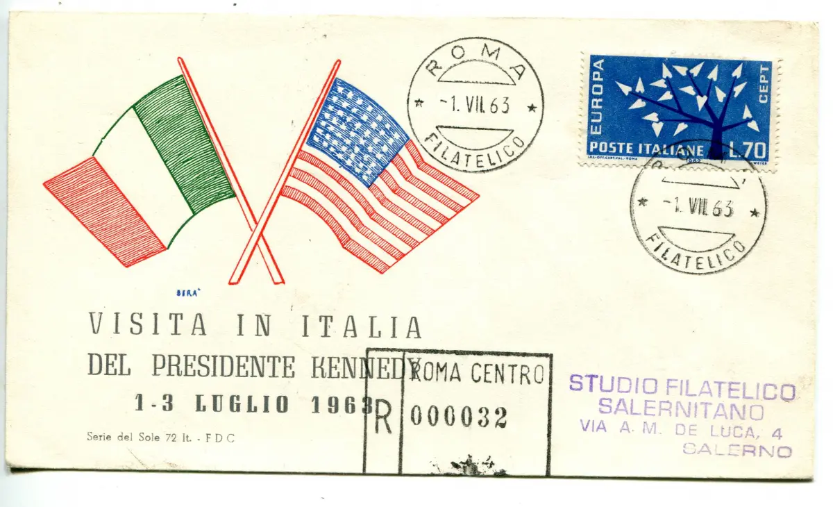 - Spezieller Umschlag anlässlich des Italienbesuchs des Präsidenten der Vereinigten Staaten von Amerika vorbereitet - gereist Racc. von Rom 1.7.63 nach Salerno mit Ankunftsstornierung auf der Rückseite - - Nr. 124/WEB