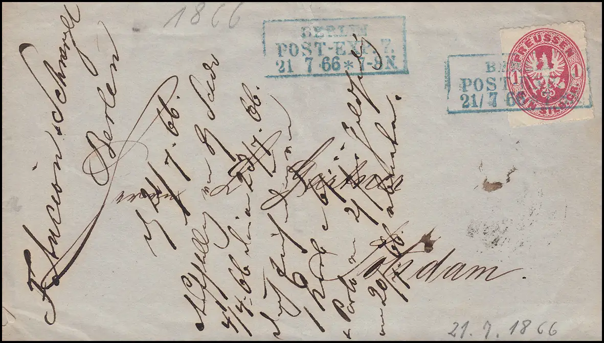 Preußen 16 Adler 1 Sgr EF Brief Rahmen-O BERLIN POST-EXP. 7 - 21.7.66 n. Potsdam