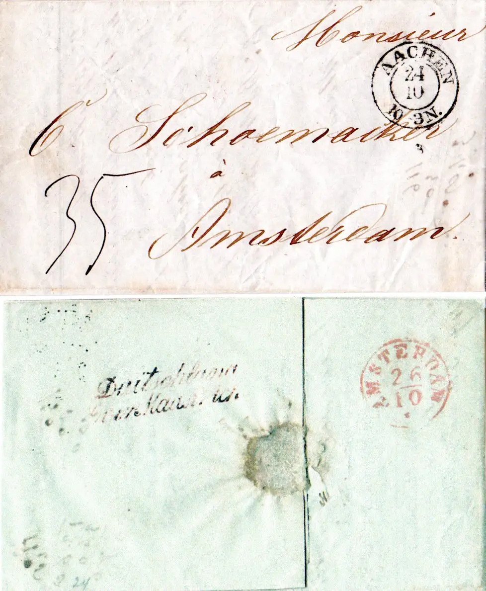 Preussen 1844, K2 AACHEN auf Porto Brief n. NL m. rücks. Transitstpl.