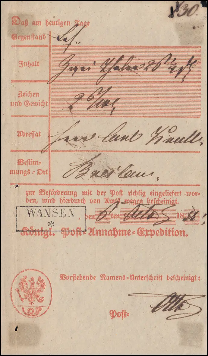 Preußen Einlieferungsschein über Geldbegleitbrief Rahmen-O WÄNSEN 1856 n.Breslau