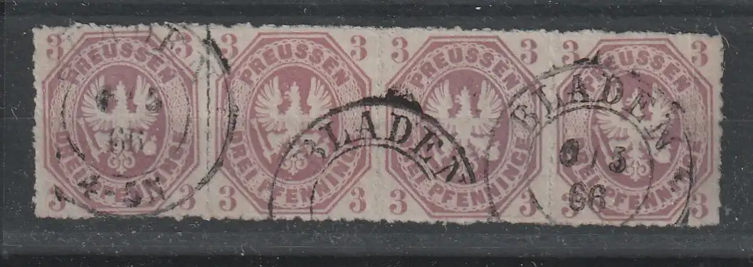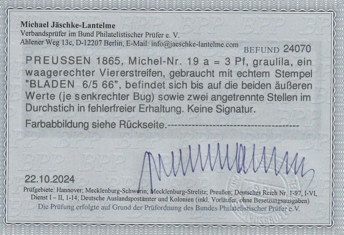 Preußen Nr. 19 a im gest. Viererstreifen, Befund Jäschke-Lantelme BPP