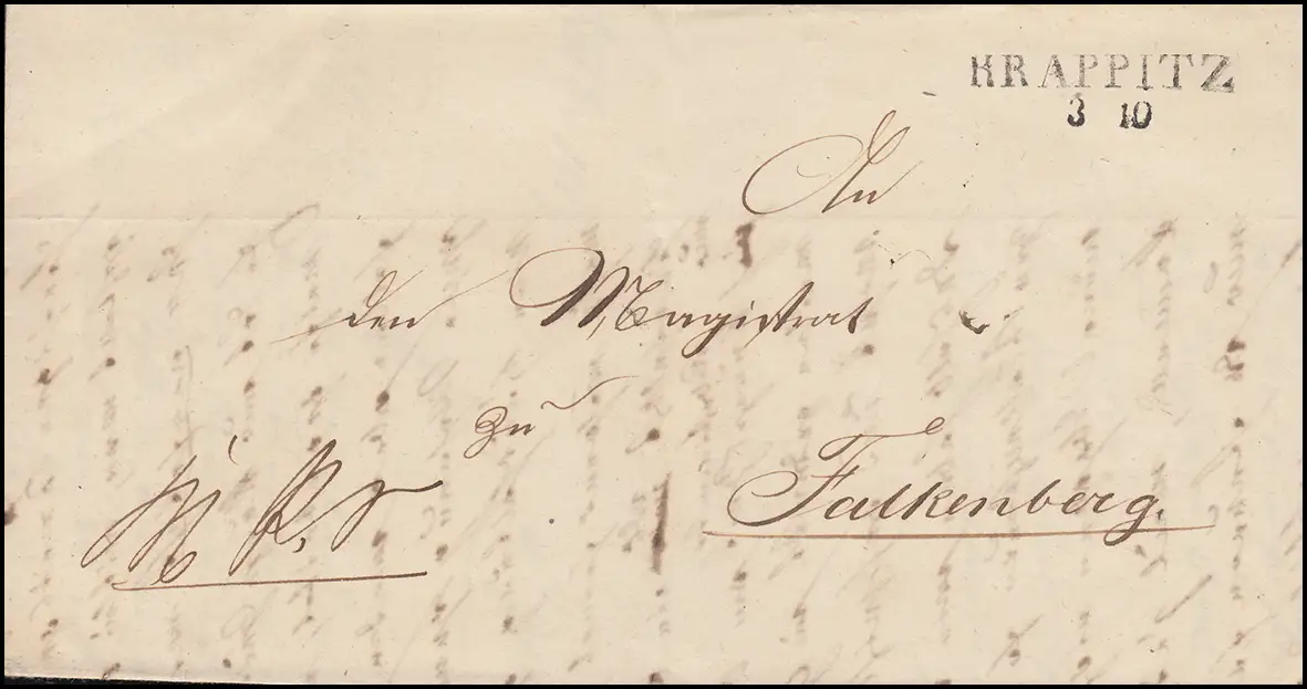 Preußen Vorphilatelie Faltbrief Zweizeiler KRAPPITZ 3.10.1849 nach Falkenberg