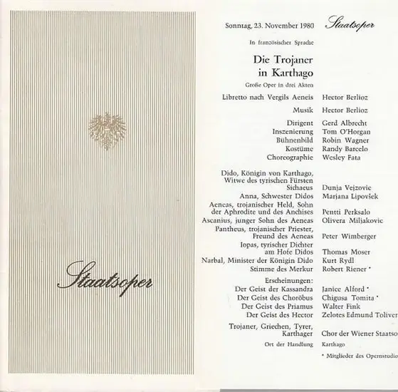 Programmheft / Zettel . Staatsoper Wien. Hector Berlioz (Libretto / Musik): Die Trojaner in Karthago. Große Oper in 3 Akten. Spielzeit 1980. Dirigent Gerd Albrecht. Inszenierung Tom O`Horgan. Bühnenbild Robin Wagner. Kostüme Randy Barcelo. Chor