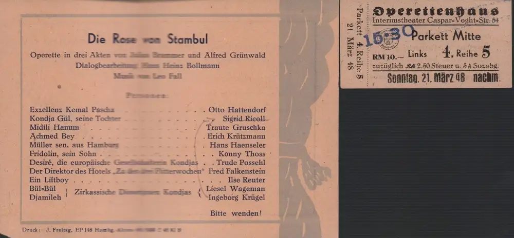 Programm zu "Die Rose von Stambul". Operette in drei Akten von J. Brammer u. A. Grünwald. Dialogbearb. H. H. Bollmann. Musik von Leo Fall. Unter der Regie von Hans Herbst und der musikalischen Leitung von Edwin Schumacher spielten und sangen u.a. Otto Hattendorf, Traute Gruschka, Trude Possehl. - Das Operettenhaus am Spielbudenplatz, 1944 zerstört, eröffnete im Oktober 1945 als Operettenhaus Interimstheater in einer Aula der Schule Caspar-Voght-Straße und zog 1948 um ins Palladiumtheater in einen der Säle am Besenbinderhof. - BEIGABE: Eintrittskarte für die Nachmittagsvorstellung am 21. März 1948. Mit Angabe von Steuer und Sozialabgaben