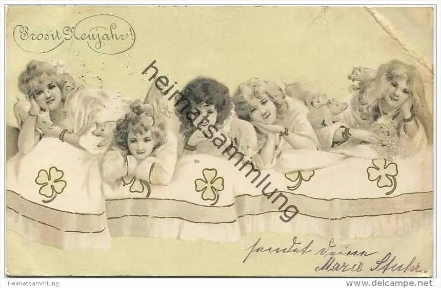 Prosit Neujahr - fünf Mädels mit Glücksschweinchen - Gebrauchsspuren - Eckknick oben rechts (G30310) gel. 1903