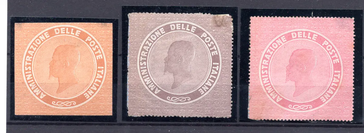Linguellato MH - Vitt. Emanuele II. - Lot von drei Siegelproben der italienischen Postverwaltung - Farben Orange, Rosa und Braun - weisen Mängel auf (ausdünntes Papier), aber zwei davon sind von Enzo Diena signiert - Uncommon Cod.1916/WEB