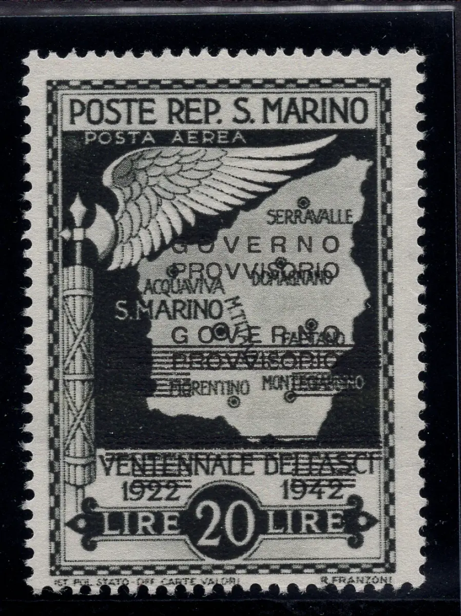 MNH - Vollgummi - Provisorische Regierung Luftpost Lire 20 Nr. A47 Doppelaufdruck, der zweite stark nach oben verschoben, neuer perfekter Vollgummi - Nicht katalogisiert Cod. 3138 / WEB