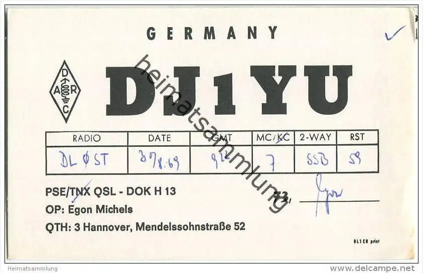 QSL - Funkkarte - DJ1YU - Hannover - 1969