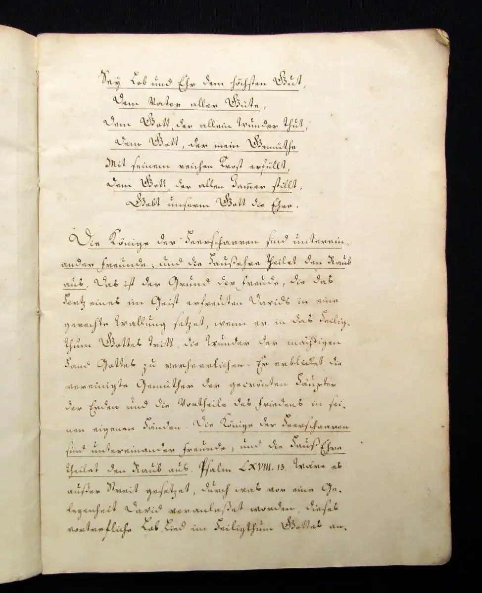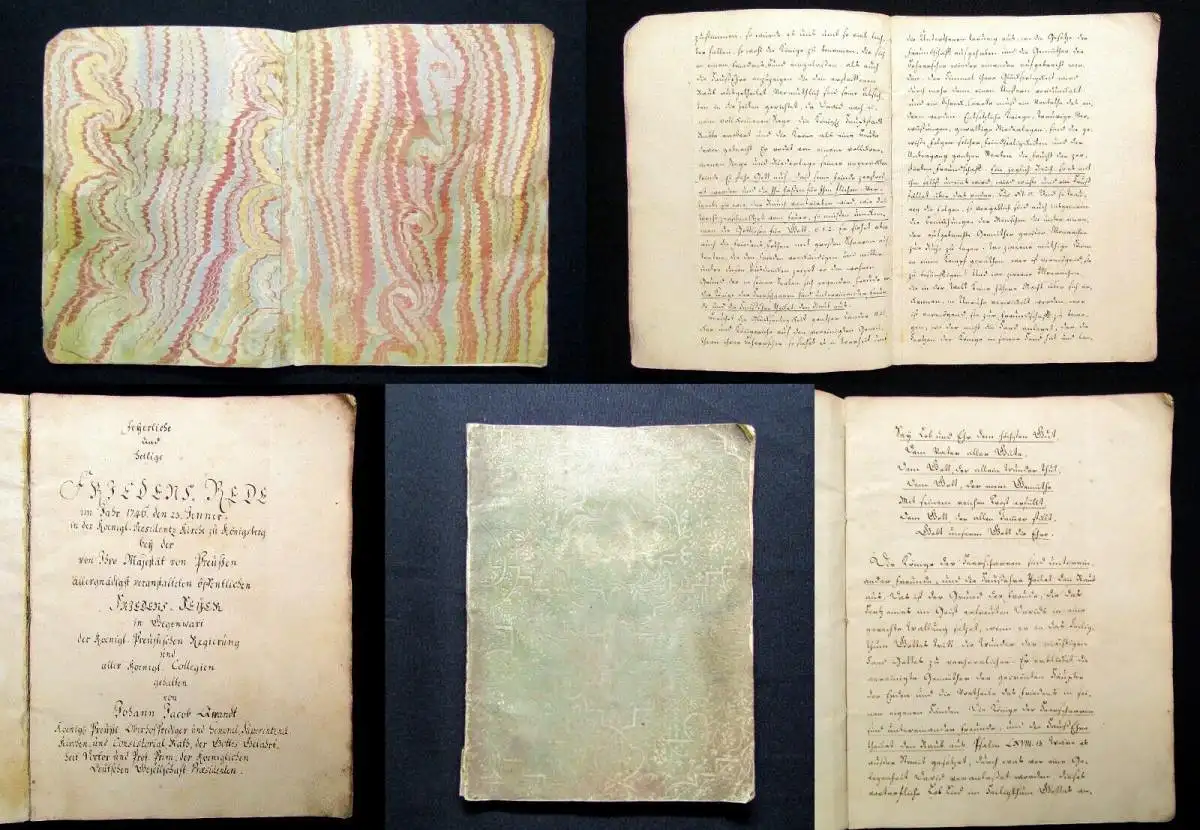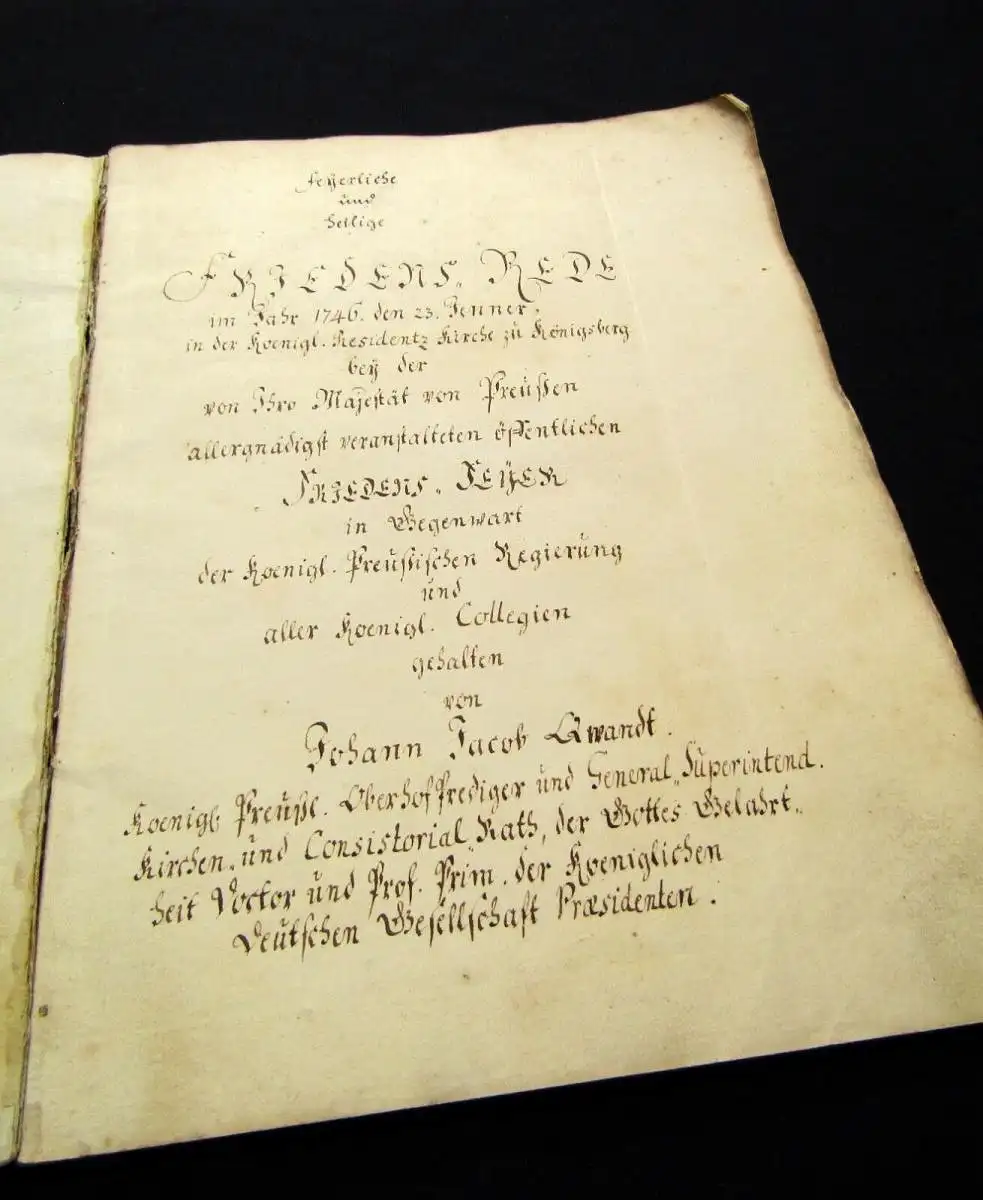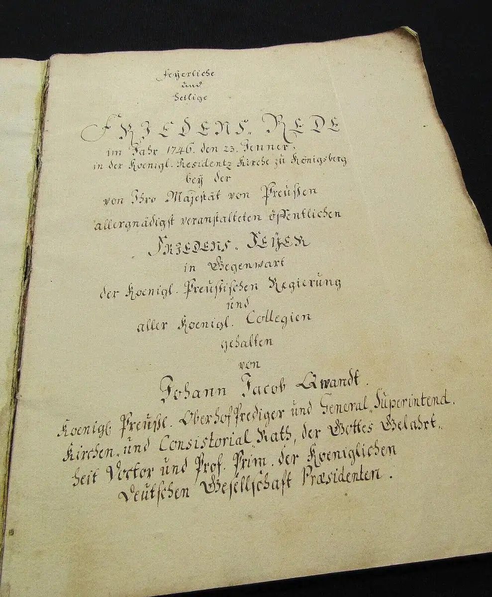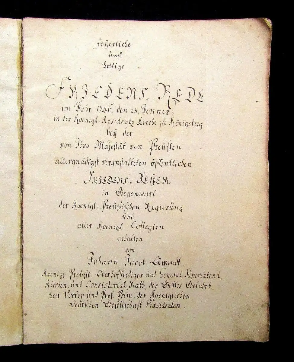 Feyerliche und heilige Friedens Rede im Jahr 1746. den 23. Jenner, in der koenigl. Residentz Kirche zu Königsberg bey der von Ihro Majestät von Preußen allergnädigst veranstalteten öffentlichen Friedens-Feyer in Gegenwart der Koenigl.-Preußischen Regierung und aller koenigl. Collegien gehalten. Deutsche Handschrift auf Papier