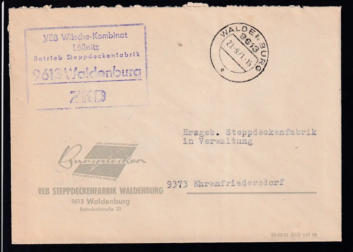 R5 VEB Wäsche-Kombinat Lößnitz Betrieb Steppdeckenfabrik 9613 Waldenburg ZKD auf Brief