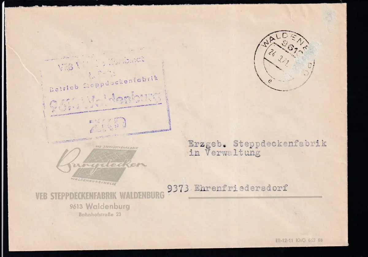 R5 VEB Wäsche-Kombinat Lößnitz Betrieb Steppdeckenfabrik 9613 Waldenburg ZKD auf Brief
