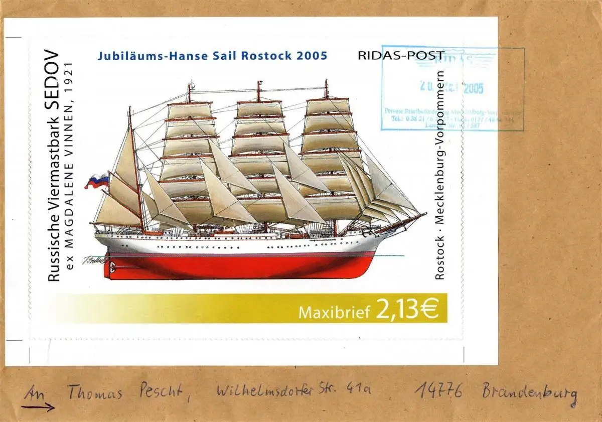 • MichSeite RIDAS: MiNr. 23 Bl. 1, 01.05.2005,"15. Hanse Sail", Block, Ganzstück Beschreibung \nAusgabeland: Bundesrepublik Deutschland \nPostdienstleister: RIDAS, Ribnitz-Damgarten \nAusgabeanlass: Briefmarkenausgaben "15. Hanse Sail" Katalognummer: MiNr. 23 Bl. 1 Ausgabedatum: 01.05.2005 Nominale: Satz (1 Wert, Block) zu 2,13 EUR \nTyp: - \nErhaltung: nassklebend, durchstochen, Ganzstück (Umschlag) \nHinweis: vermutlich größte Briefmarke der Welt Thema: Ostsee, Schiffe, Segelschiffe