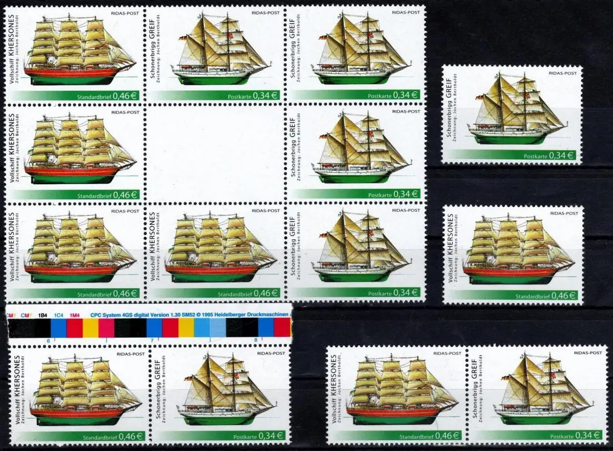 • MichSeite RIDAS: MiNr. 9 - 10, 05.08.2004, "Hanse Sail 2004", LOT, postfrisch Beschreibung \nAusgabeland: Bundesrepublik Deutschland \nPostdienstleister: RIDAS, Ribnitz-Damgarten \nAusgabeanlass: Briefmarkenausgaben "Hanse Sail 2004" Katalognummer: MiNr. 9 - 10 Ausgabedatum: 05.08.2004 Nominale: LOT mit 14 Werten zu 0,34 EUR (7 x), 0,46 EUR (7 x) \nTyp: - \nErhaltung: nassklebend, gezähnt, postfrisch \nHinweis: u. a. seltenes Herzstück aus Druckbogen und Randleiste Thema: Schiffe, Segelschiffe, Seefahrt, Ostsee, Rostock