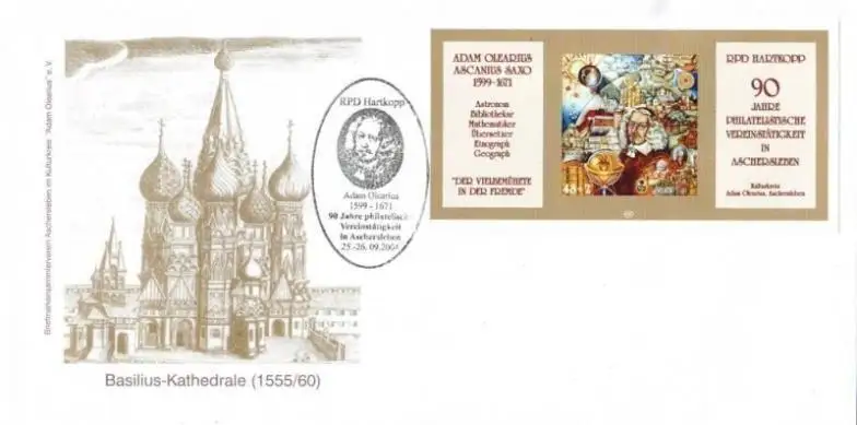 • MichSeite RPD Hartkopp: MiNr. 5 / Block 1, 25.09.2004, "Adam Olearius", FDC mit Wert zu 0,48 + 0,02 EUR, Ersttagssonderstempel "Adam Olearius" Beschreibung \nAusgabeland: Bundesrepublik Deutschland \nPostdienstleister: RPD Hartkopp, Aschersleben \nAusgabeanlass: Briefmarkenausgabe "Adam Olearius" Katalognummer: MiNr. 5 / Block 1 Ausgabedatum: 25.09.2004 Nominale: Satz (1 Wert) zu 0,48 + 0,02 EUR \nTyp: - \nErhaltung: nassklebend, geschnitten, FDC (Ersttagsbrief), Ersttagssonderstempel "Adam Olearius" \nHinweis: - Thema: Astronomie, Bibliothekar, Mathematiker, Übersetzer, Etnograph, Geograph,. Rußland, Moskau, Basilius-Kathedrale, Gottorfer Globus