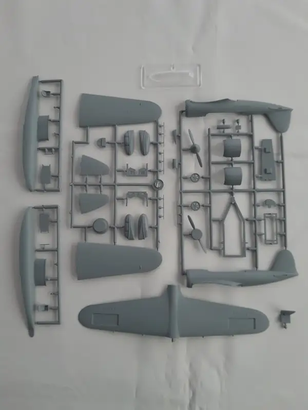 Einzelteile (Plastikbauteile) sind noch am Rahmen fixiert. 2 Bauteile befinden sich nicht am Gussrahmen. Sichthülle wurde geöffnet.