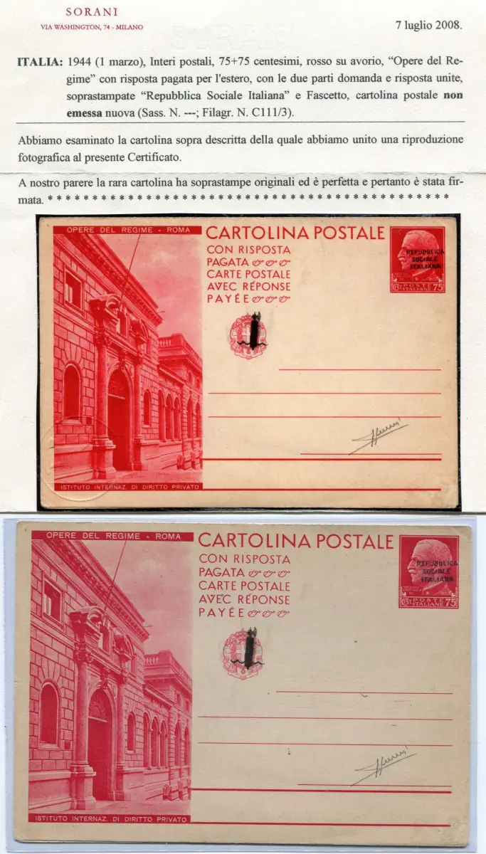 R.S.I. - C.P. Werke des Cent-Regimes. 75 + 75 - nicht ausgegeben Nr. C 111/3 - R.S.I. - C.P. Werke des Cent-Regimes. 75 + 75 - nicht ausgegeben Nr. C 111/3 mit Vignetten Institut für Recht + Mussolini-Kaserne - Neu in gutem Erhaltungszustand - Selten - Zert. Sorani - Kat. euro 1.250 Code 992/11