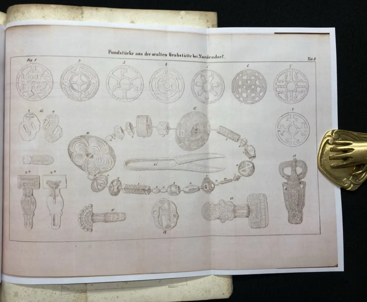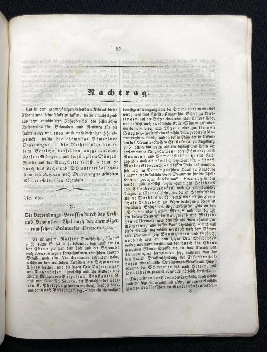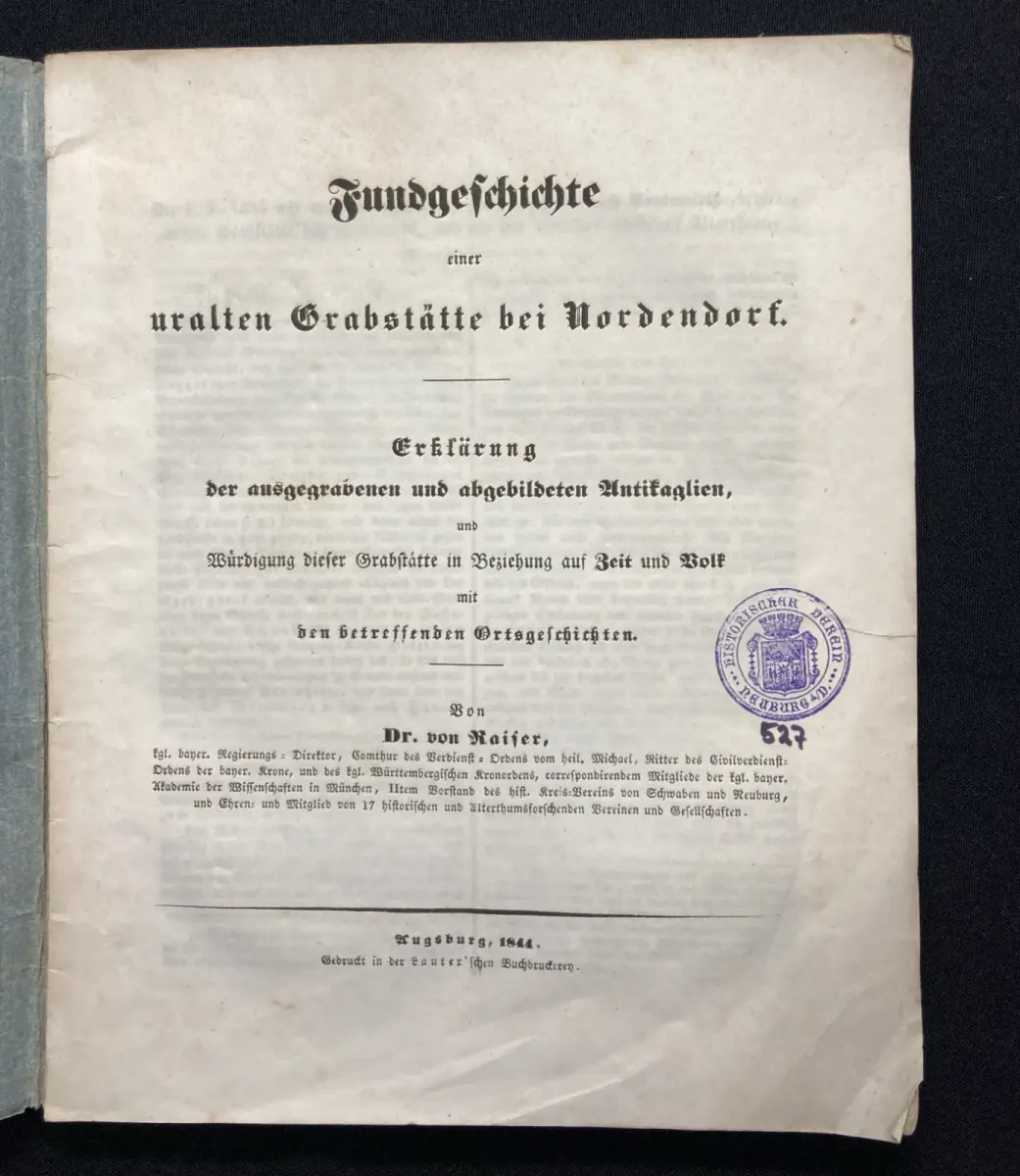 Einband eselsohrig, Papier gering gebräunt und beide Spiegel sowie Titel beschrieben und gestempelt vom Historischen Verein Neuburg. Fehlende Tafeln in Kopie beigegeben( diese sind im Preis bereits berücksichtigt)