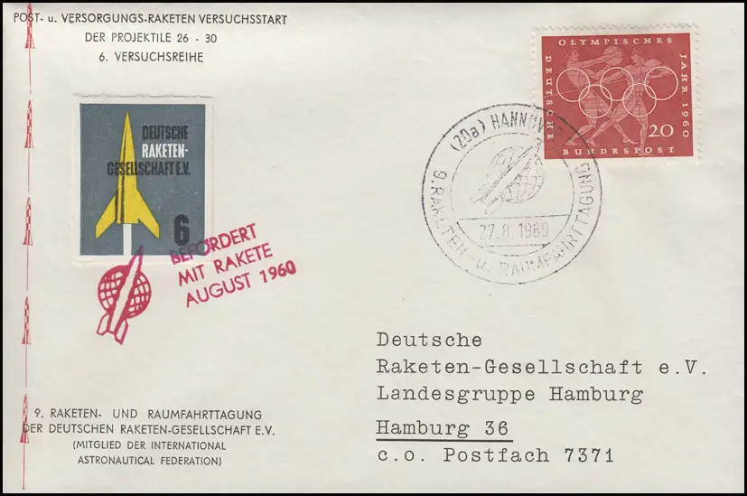Raketenpost anläßlich der 9. Raketen- und Raumfahrttagung der Deutschen Raketengesellschaft August 1960