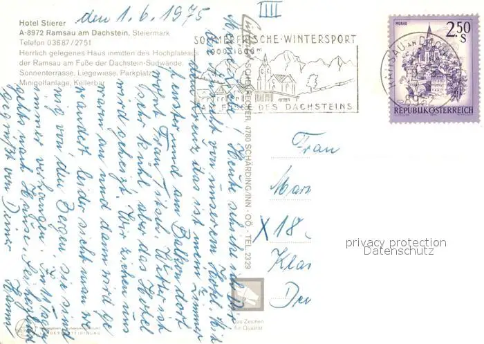 Ramsau_Dachstein_Steiermark Hotel Stierer Ramsau_Dachstein postalisch gelaufen 1975 Erhaltung siehe scans [FriedD77] Frierer