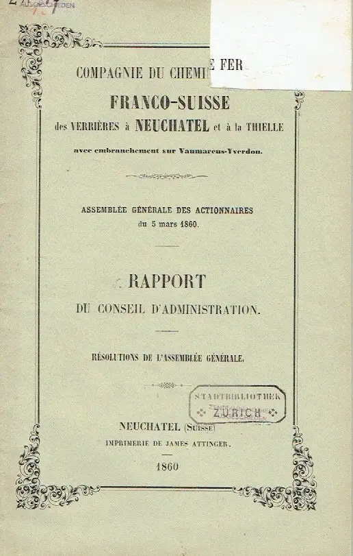 Herausgeber: Compagnie du Chemin de Fer Franco-Suisse des Verrières à Neuchatel et à la Thielle avec embranchement sur Vaumarcus-Yverdon