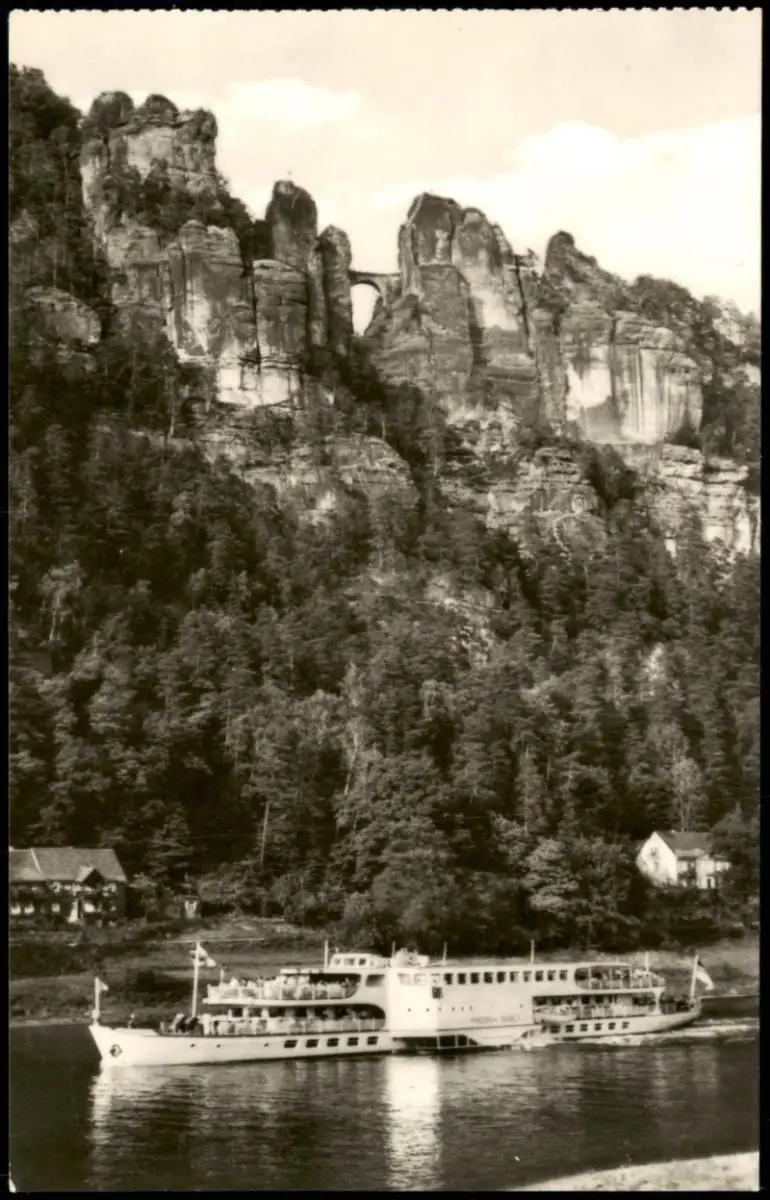 Rathen Elbe Schiff MS Friedrich Engels passiert Sächs. Schweiz - Bastei 1971