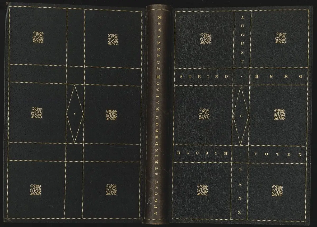 Bemerkungen: Deutsche Erstausgabe der beiden Werke von August Strindberg (1849-1912) in einem unsignierten, jedoch stark an den Stil der Wiener Werkstätte erinnernden schwarzen Handeinband. Die Deckel sind je in 6 Quadrate mit rechteckigen Zwischenfeldern unterteilt, in die auf dem Vorderdeckel die Autoren- und Titelangabe geprägt wurde. Das mittlere Rechteck enthält eine vertikale Raute. Mittig in den 6 Quadraten sind kleine quadratisch-florale Stempel gedruckt. Die Vorsätze wurden mit schwarz-weißem Kleisterpapier gestaltet.