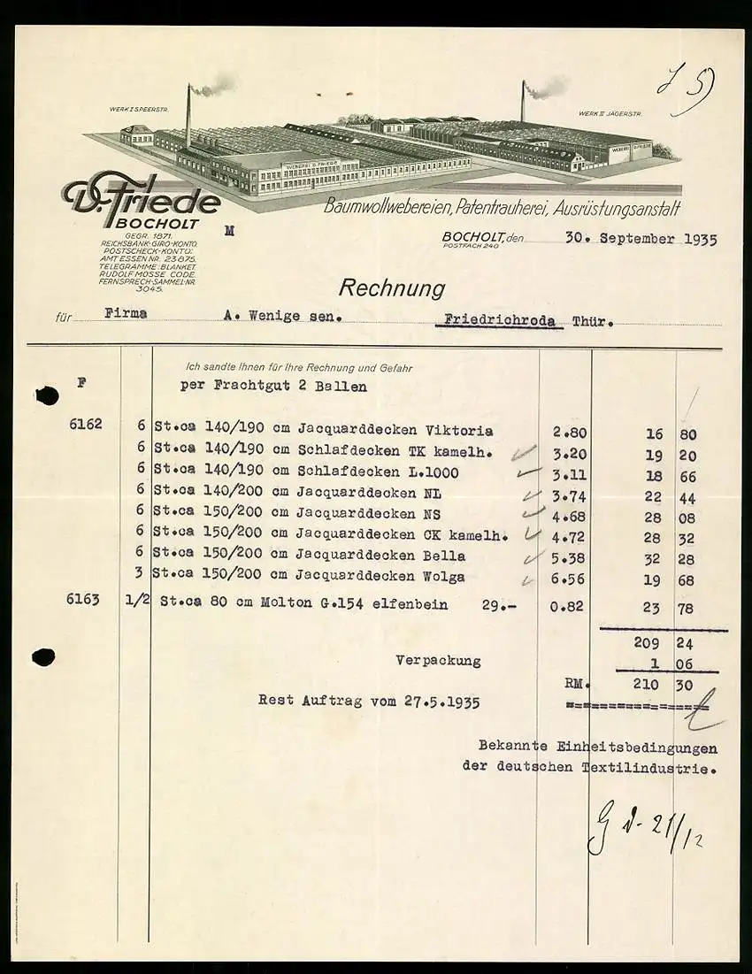 Rechnung Bocholt 1935, D. Friede, Textilfabrikation, Modellansichten der Werke in Speer- und Jägerstrasse