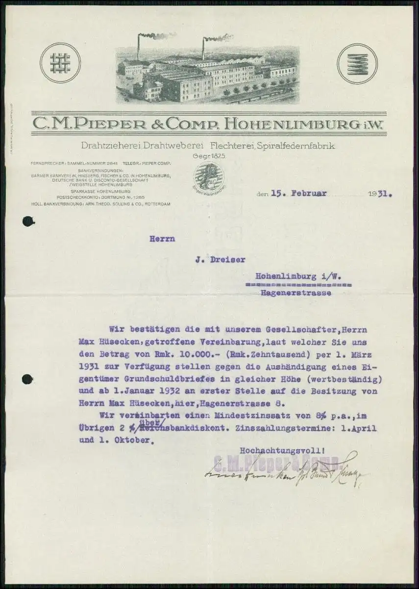 Rechnung Fabrikanlage 1931 Hohenlimburg Hagen -C. M. Pieper & Comp. Drahtweberei