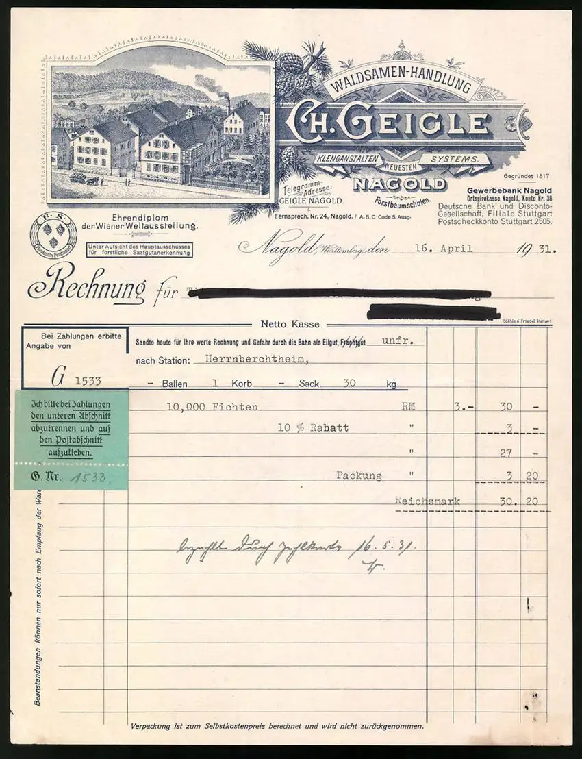 Rechnung Nagold 1931, Waldsamen-Handlung Ch. Geigle, Blick auf das Werk