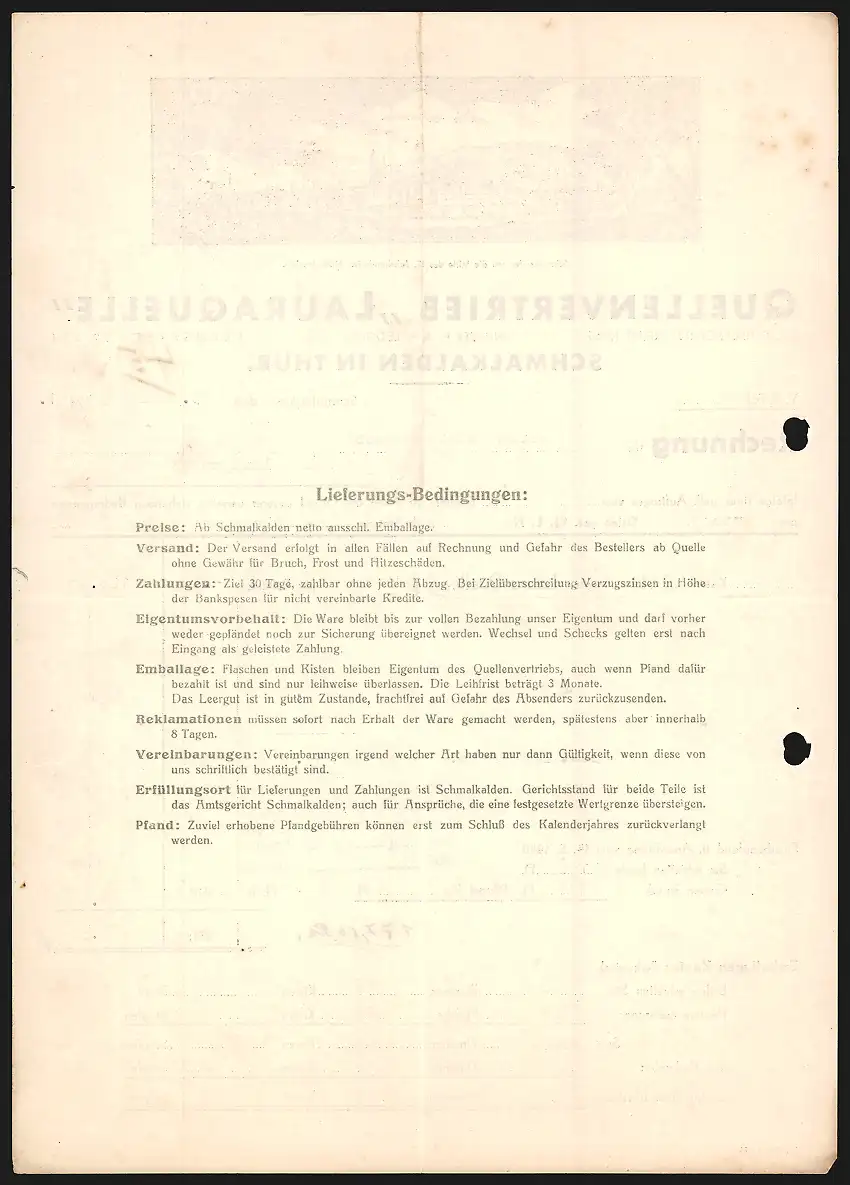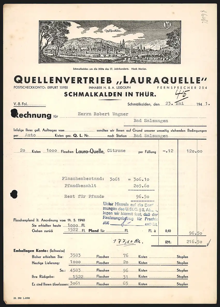 Rechnung Schmalkalden in Thür. 1941, H. & A. Leidolph, Quellenvertrieb Lauraquelle, Ortsansicht aus alter Zeit
