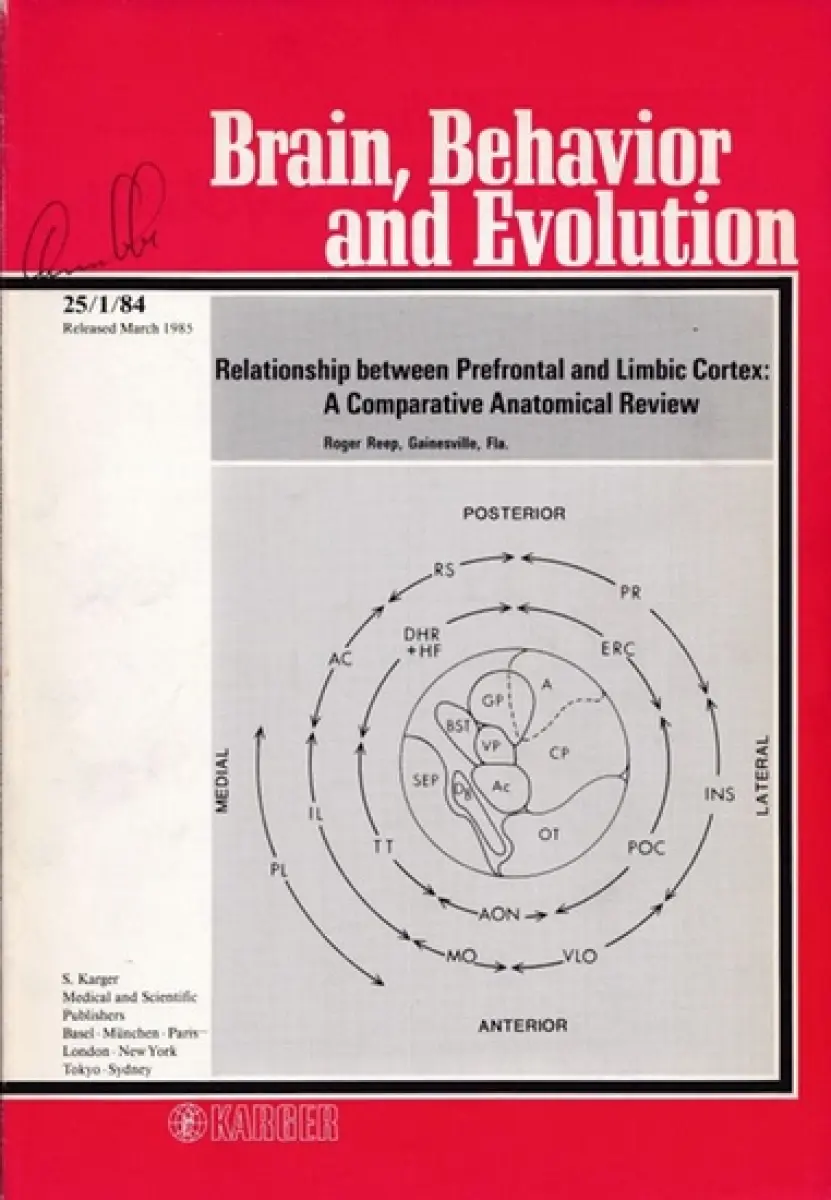 Reep, Roger / W. Riss (Ed.): Relationship between Prefrontal and Limbic Cortex: A Comparative Anatomical Review - IN : Brain, Behavior and Evolution, Vol. 25, No. 1, 25/1/ 84, released March 1985.