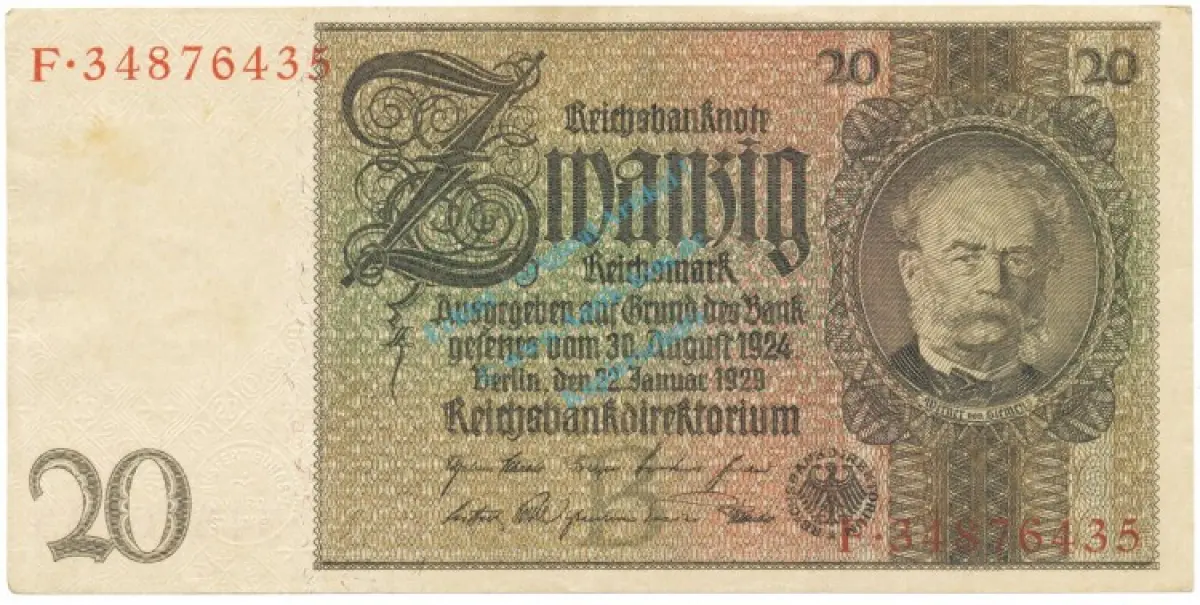 Reichsbanknote , 20 Mark Schein -B 2- in unc-kfr. DEU-184.a, Ros.174, P.181 Weimarer Republik 1929 ReichsbankUnterdruck Buchstabe = B , Serie = B, C, D, E, F, G