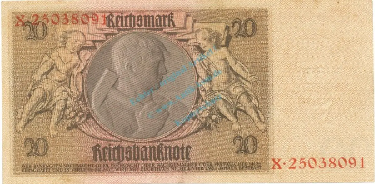 Reichsbanknote , 20 Mark Schein -M 2- in unc-kfr. DEU-184.b, Ros.174, P.181 Weimarer Republik 1929 ReichsbankUnterdruck Buchstabe = B , Serie = V, W, X, Y, Z