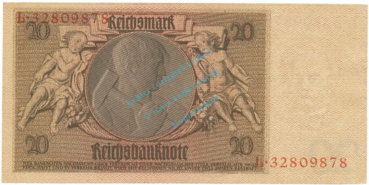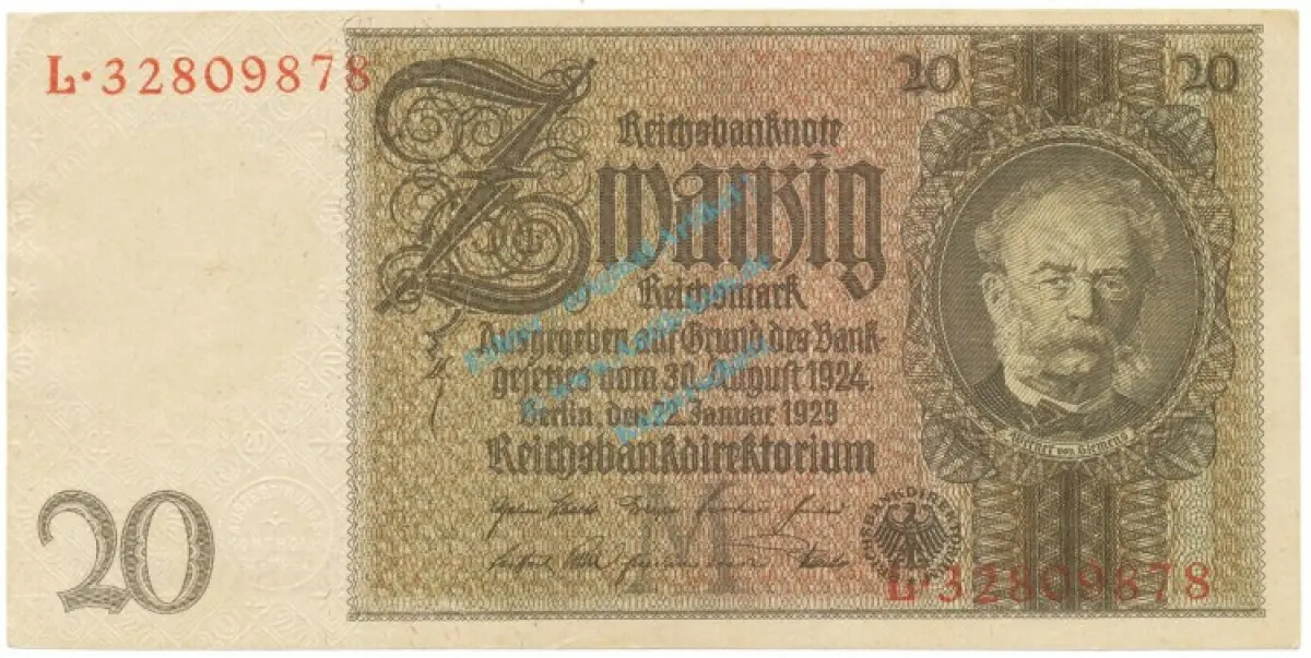 Reichsbanknote , 20 Mark Schein -M 2- in unc-kfr. DEU-184.b, Ros.174, P.181 Weimarer Republik 1929 ReichsbankUnterdruck Buchstabe = M , Serie = H, J, K, L, M, N, O