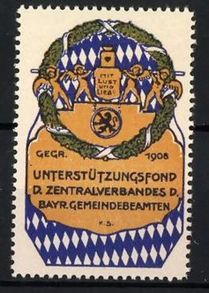 Reklamemarke Bayern, Unterstützungsfond d. Zentralverbandes Bayr. Gemeindebeamten, Kranz mit Figuren und Löwe