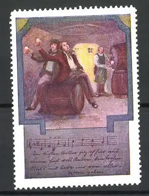 Reklamemarke Herren feiern in einem Weinkeller, Text- und Notenzeile