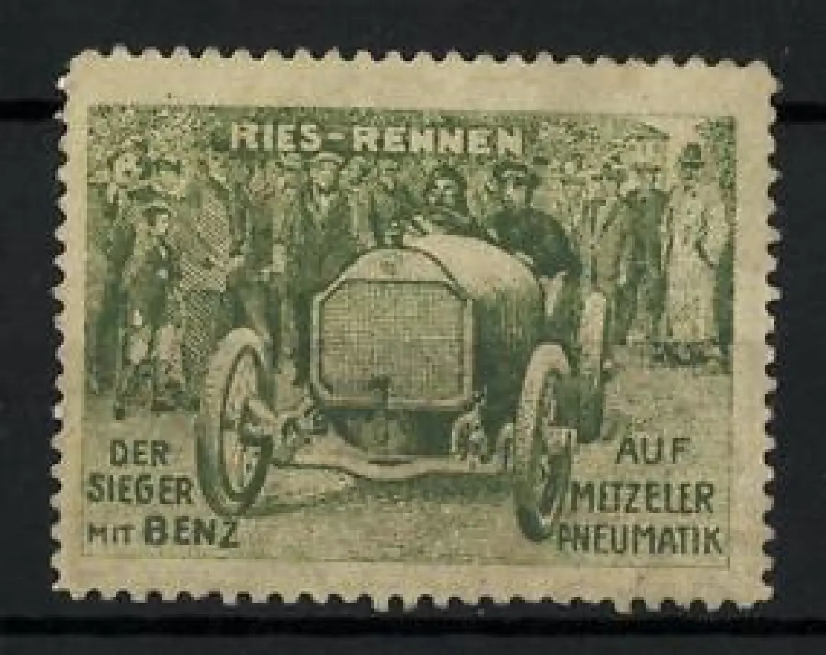 Reklamemarke Metzeler Pneumatik, Ries-Rennen, Der Sieger mit Auto Benz Rennwagen