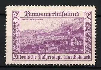 Reklamemarke Ramsau, Ramsauerhilfsfond, Landschaft mit Kirche und Dachstein