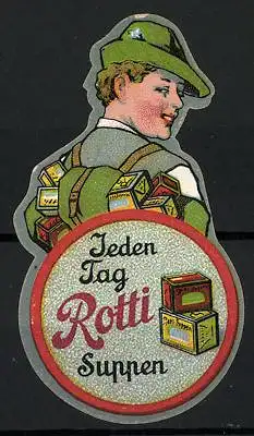 Reklamemarke Rotti Suppen, Wanderin mit gefülltem Rucksack