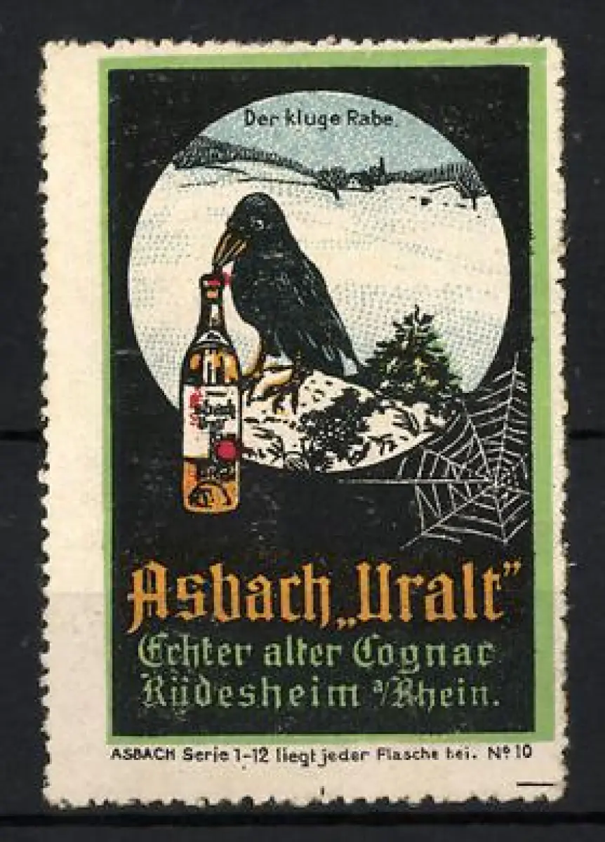 Reklamemarke Rüdesheim am Rhein, Asbach Uralt, Rabe mit Flasche