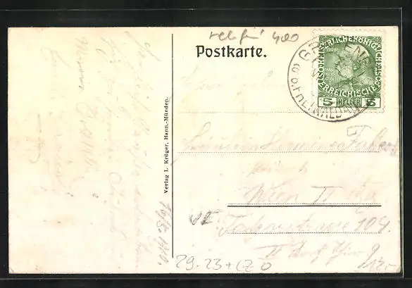 alte Ansichtskarte, gelaufen, Bugspur oben mittig, guter Zustand