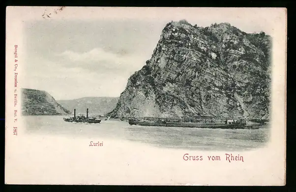 Relief-AK Dampfer und Frachtkahn an der Loreley