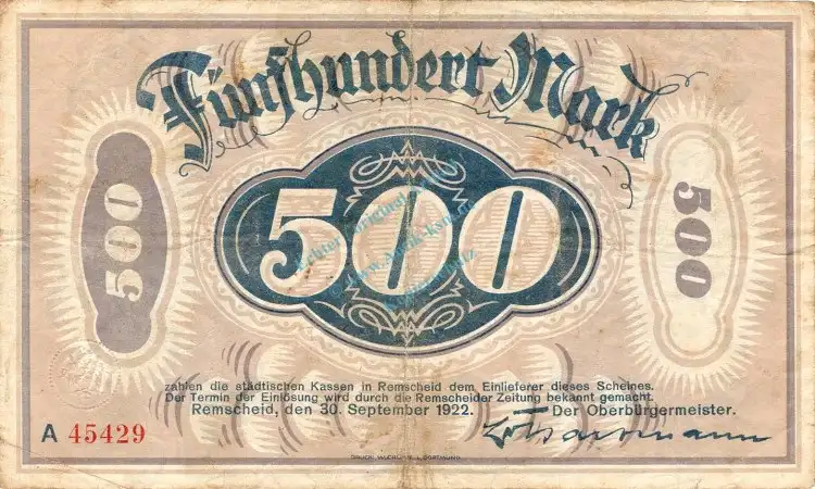 Remscheid , Banknote 500 Mark Schein gbr. Müller 3705.1 , Rheinland 1922 Inflation
