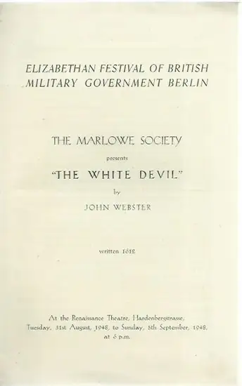 Titel: Programmheft / program booklet: The white devil. The Tragedy of Paulo Ursini, Duke of Brachiano, and Vittoria Corombona. The Marlows Society presents. Elizabeth Festival of British Military Government Berlin. Mit Darstellerliste und Inhaltsangabe. With cast list and contents. Aufführung / performance: September 1948