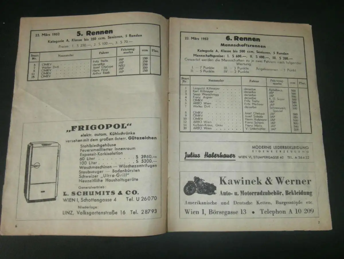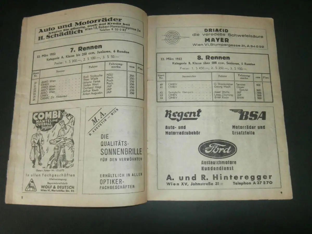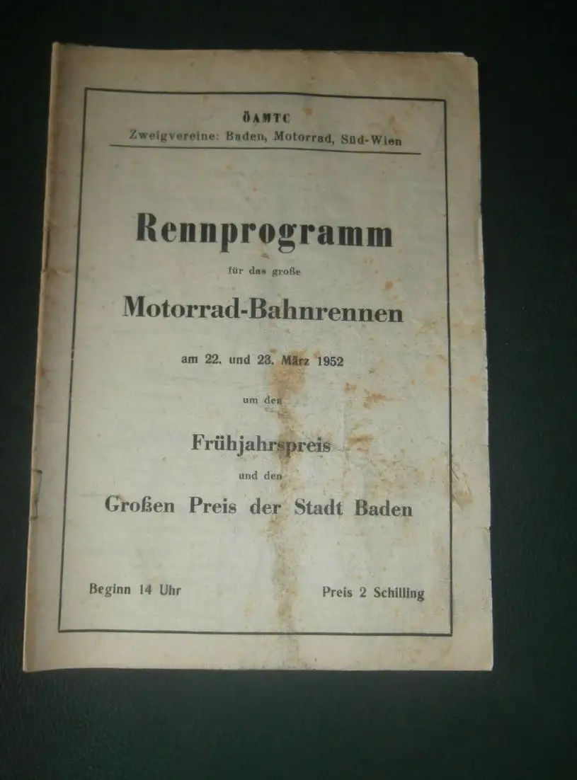 Rennprogramm Bahnrennen in Baden 1952 , Sandbahnrennen , Speedway , Wien , Programm , Programmheft !!!
