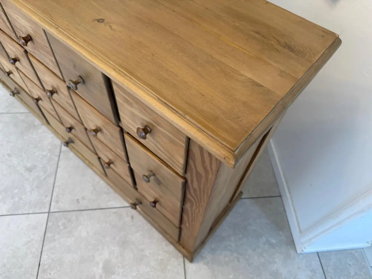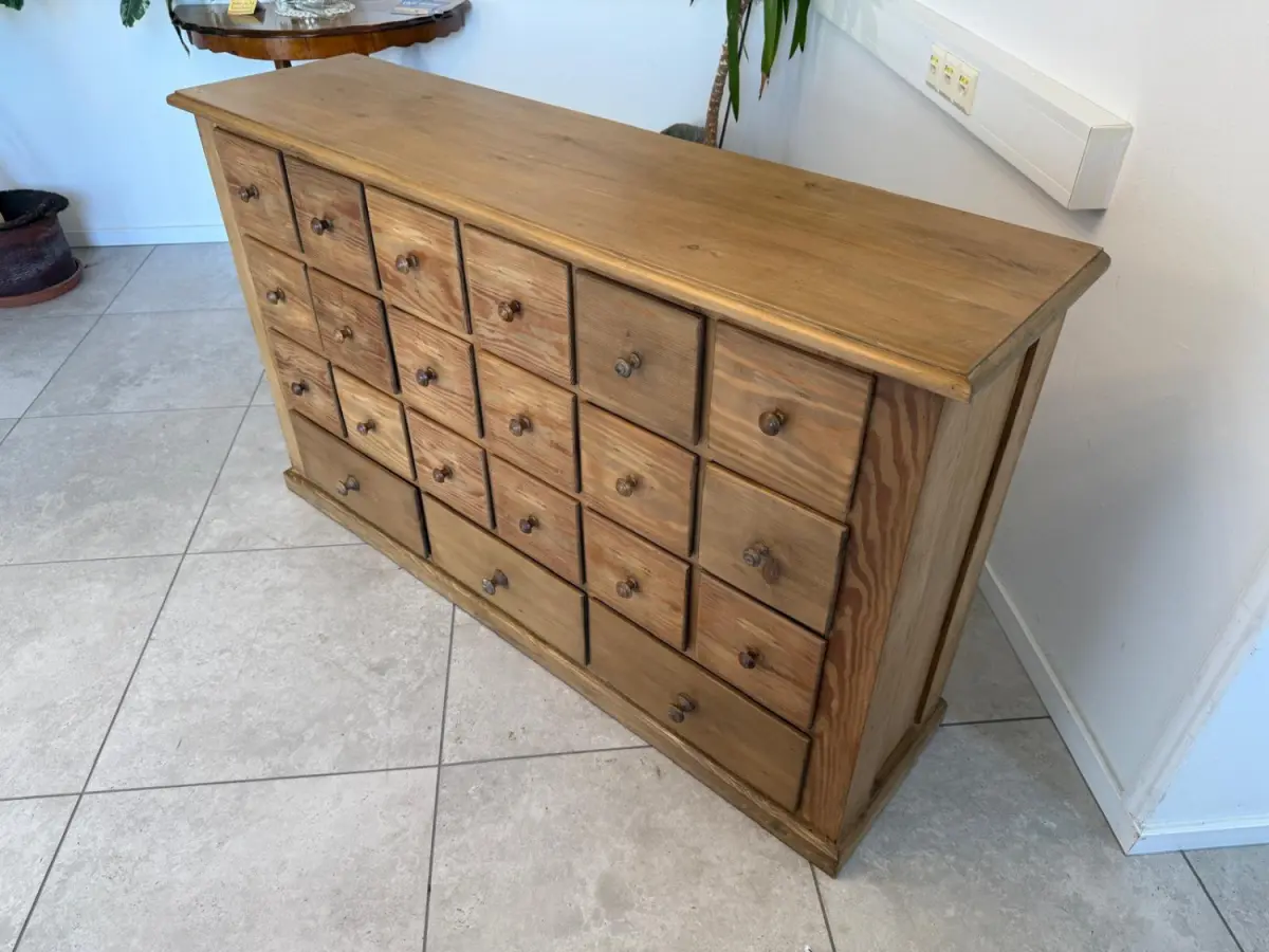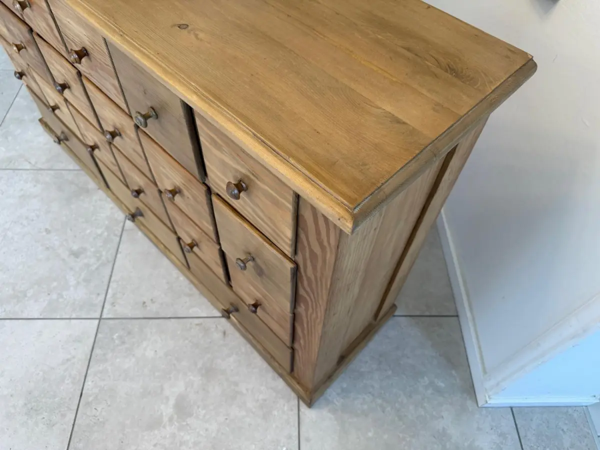 21 Schubladen, alle voll funktionstüchtig, sauber laufend und mit original gedrechselten Knöpfen versehen.
