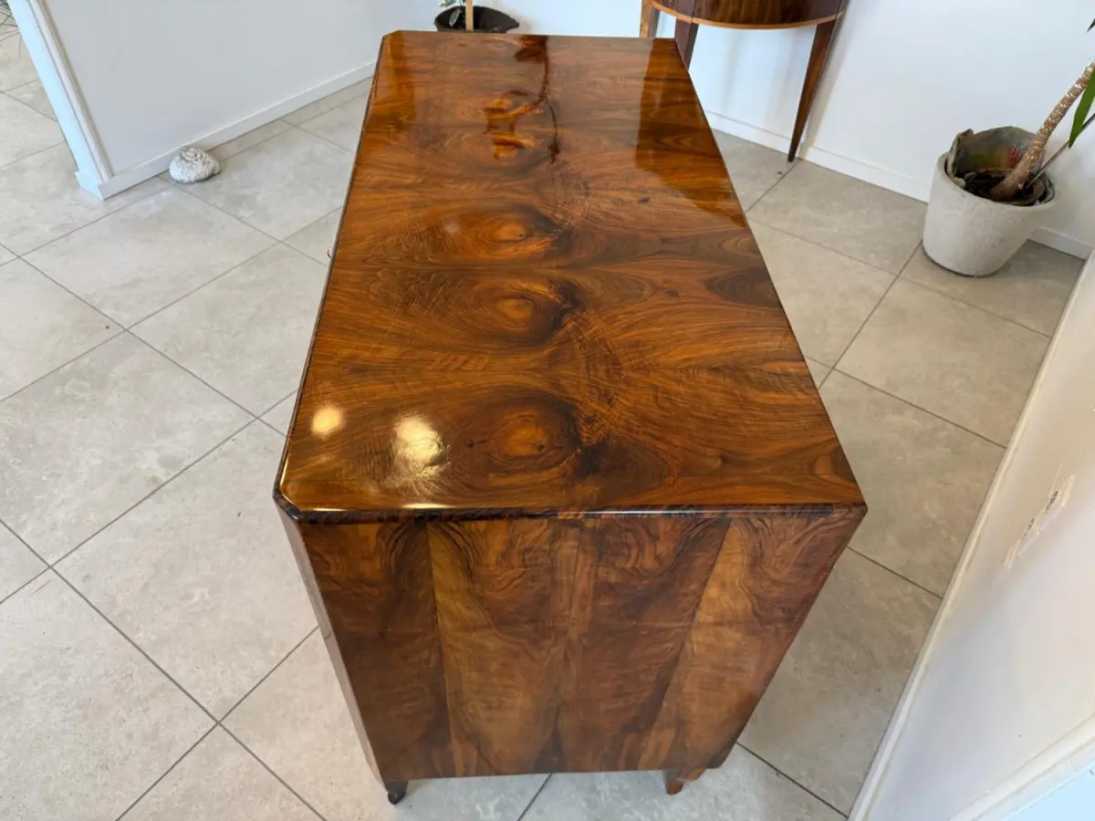 Das Möbel besticht durch seine außergewöhnlich schöne Furnierbild-Komposition mit intensivem Nussholz Furnierbild und hochglänzender Schellack-Handpolitur.