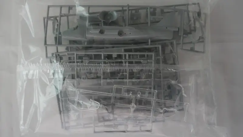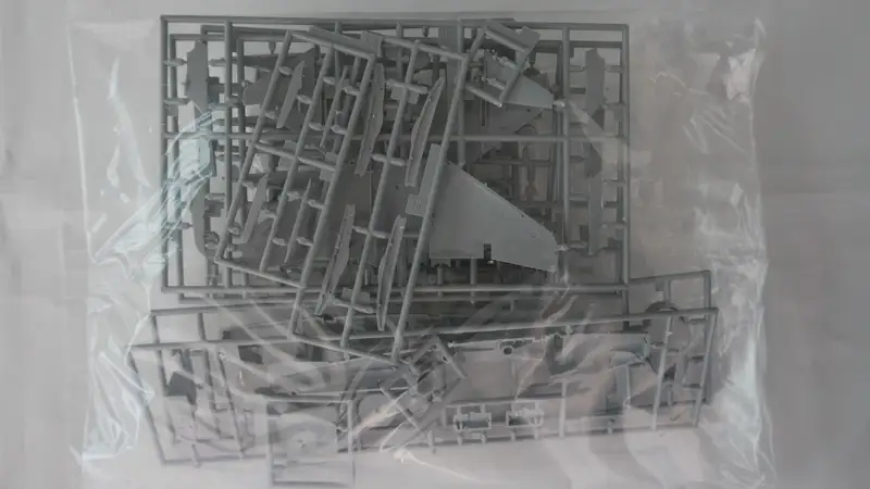 Einzelteile (Plastikbauteile) sind noch am Rahmen fixiert, Sichthülle wurde geöffnet.