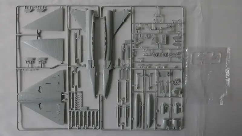 Einzelteile (Plastikbauteile) sind noch am Rahmen fixiert, Sichthülle wurde geöffnet.