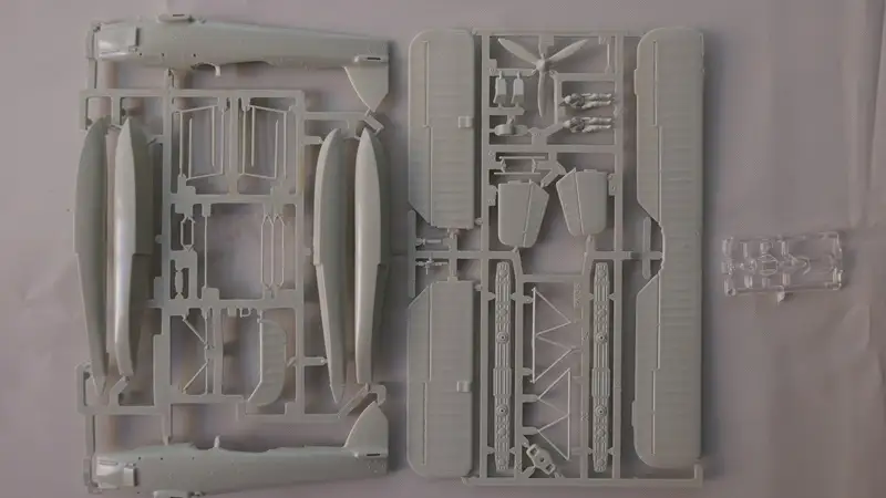 Einzelteile (Plastikbauteile) sind noch am Rahmen fixiert; Sichthülle wurde geöffnet.